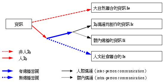 演講之前,容我藉此機會由衷地感謝悟因長老。剛才,悟因長老叫我「老人家」,這稱呼令我訝異,當下的直覺是「很不敢當啦!」;但想想,真的呀,我已年過七十,該算是老人囉。今天跟大家講話,對我「老人家」來講是很難得的機緣。年過古稀,平時深居簡出的我,極少參加學術或應酬活動;但接到悟因長老跟自衍法師的邀請,我義不容辭。為什麼?因為香光尼眾佛學院二十多年來一直把雜誌、書籍寄給我,使我非常方便的親近佛法;這對我有非常大的幫助。這麼多年來,對悟因長老和自衍法師,我一直懷著極度感恩的心,不知何以為報。這就是我受邀後一定要來,並能夠在此和各位見面的原因。今天和大家講的題目是「資訊的緣起」。「緣起」是說資訊是怎麼來的,也就是說資訊產生的因、緣、果。這實在不是好講的題目,因為問題牽涉的範疇是既深且廣,不是純粹用科學的方法便可以解決的。這個題目花了我退休後十年多的時間,慢慢爬梳整理,才形成了今天的講稿。今天向大家報告的資料,沒有在其他任何一個地方報告過,所以,若有疑問、缺點,敬請提出,希望大家不吝指正。 本文從「前言」到「研究方法的思考」這部分,全是與問題背景相關的說明,約占全文之半。其餘的部分是講資訊的緣起。 本文承香光尼眾佛學院的法師們依演講錄音謄寫,省了筆者許多精力與時間,特此致謝。謄寫稿經本人增補、潤飾而成本文。 一、前言 資訊由Information譯來(本文以下資訊一詞皆指此義),是一個非常重要的概念。至於它究竟指什麼?現況是:每個行業各說各話,說的都不一樣;工程有工程的說法,藝術有藝術的說法,文學有文學的說法,而且其間常常矛盾。2004年,有學者說:「資訊是目前最重要、影響最廣、卻了解最少的技術概念」。(註1)其實,這問題幾乎無處不在,一直環繞在我們四周,我們雖然到處都熱熱鬧鬧地進行電腦化、網路化、數位化……,然而資訊是什麼?到現在還是不太清楚;大家只是就自己的行業裡面界定它,覺得還可以用,就用下去了。 近三十年,來釐清資訊定義的呼籲,在論文、書籍中時有所見,如麥登(A. D. Madden)2000年底指出,資訊的含混多義,已經困擾學術界五十年以上,亟待釐清。(註2) 二、探索跨領域的資訊界說 本文希望能夠試著解這一個學術界久懸未決的問題。解題之前,讓我們回顧早期對資訊定義的探索。 (一)麥克魯普 麥克魯普(Fritz Machlup, 1902-1983)是第一位游走於各領域,探索資訊界說的學者。1950年代,麥克魯普注意到資訊或知識對產業的影響越來越大,於是率先開始研究這個問題。他在花甲之年,發表了一本專書The Production and Distribution of Knowledge in the United States,討論資訊或知識對美國境內產業的影響。此即資訊經濟學(Information Economics)之濫觴,也就是時下流行的「知識經濟」的鼻祖。至今,這個問題:「資訊或知識對產業有什麼影響?」仍是時下資訊經濟最關心的核心問題。 麥克魯普做上述研究時,有些問題一直困擾著他:「資訊究竟是什麼?」「它與知識有什麼關係?」這些基本的問題若無法徹底辯解清楚,就很難導出資訊或知識對產業影響的明確模式。於是,他全力探索各個學術領域中對資訊的界說。 麥克魯普於1983年1月去世。同年,他的助理把他最後累積的研究心血集結出版。這是跨領域研究資訊的第一本書──The Study of Information Interdisciplinary Messages (Fritz Machlup and Una Mansfield, New York: John Wiley & Sons, 1983),書中集結了41位學者從認知科學、神經科學、資訊學(Informatics)、人工智能、語言學、語音學、計算語言學、圖書與資訊科學、模控學(Cybernetics)、系統科學與系統哲學、信息論、知識論、社會科學、傳播學、經濟學、資訊經濟學等學門探討各個資訊的概念。 回顧麥克魯普跨領域研究資訊的這二十三年,正值資訊科技對各學科影響日益加深之際。1970年之前,電腦對各學科而言,不過是一個計算的工具,資訊科技只是輔助的角色,協助各學科做例行的計算工作。 1970年代,資料庫如雨後春筍出現,使電腦搖身一變成為處理、儲存、分析資料等不可或缺的工具。由於大量研究資料的聚集,開拓了研究人員的視野,擴大了原學科的研究範疇、更改變了人們對問題的看法,甚至創造出解釋問題的新模式。其影響反映在各學科新創的名稱上,如計算物理學、計算化學、計算語言學等。這些新的研究範疇多冠以計算(Computational)之名,有別於該學科傳統的研究內容。 1980年以後,全文資料庫興起,使電腦開始掌管研究文獻;這情況使得種種新的發展的程式、新的電腦周邊設施與資訊科技逐漸滲入各學科中,發展出各具特色之內容。於是,這些依學科內容發展的資訊科技,便以該領域的資訊學(Informatics)為名出現,如生物資訊學(Bio-informatics)、化學資訊學(Chemical Informatics)等。 近三十年來,資訊科技對各學科的影響逐漸深化之際,資訊的概念亦隨之變動。從麥克魯普的書或研究論文上,可見端倪。處此情境,麥克魯普遇到的困難可想而知,其研究結果亦難免有偏頗之失。(註3) (二)麥登與M. McCreadie和R. E. Rice 繼麥克魯普之後,陸續有不少學者試圖為資訊找個通用的定義,除了前述的麥登、拉柏和巴德之外,如Schrader(1984)、Buckland(1991)、Ruben(1992)、Meadow & Yuan(1997)和Losee(1997),他們整理各領域的資訊界說,並提出值得參考的概念。然而,對通用的定義,卻顯得一愁莫展。 麥登對Information概念和
