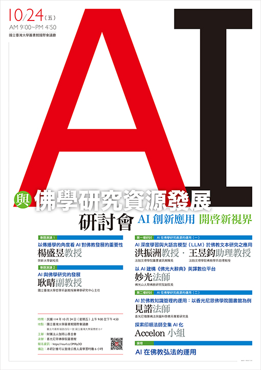會議議題: | 1. AI在佛學文本分析中的應用 2. 佛教語料與語意資料庫的建構 3. AI結合佛典查詢的創新發展 4. 佛教知識共享平臺的實踐推動 |