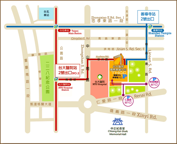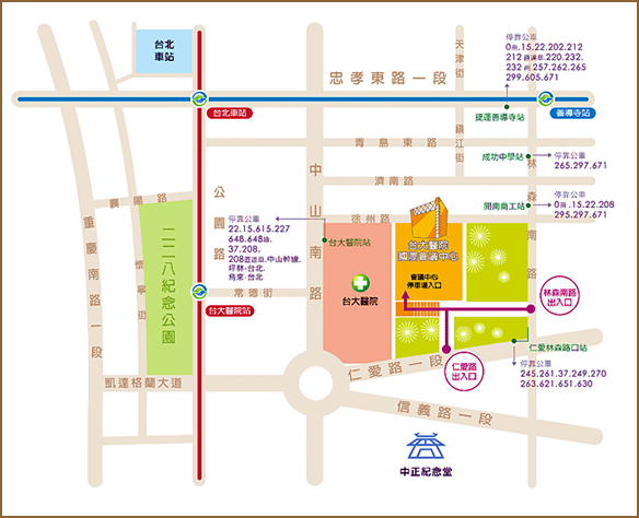 台大醫院站:22 / 15 / 615 / 227 / 648 / 648綠 / 中山幹線 / 208 / 208直達車 / 37 / 坪林-台北 / 烏來-台北