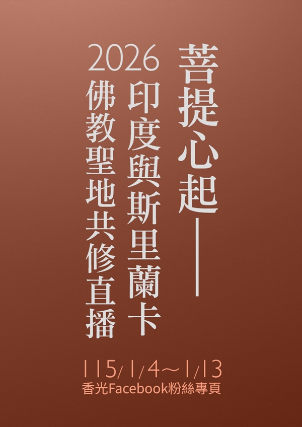 【菩提心起—2026印度與斯里蘭卡佛教聖地共修直播】佛陀足跡遍灑南亞,聖地蘊藏無上智慧與慈悲。 為延續法脈、啟迪人心, 香光尼僧團特於2026年舉辦「香光佛教聖蹟朝禮印度暨斯里蘭卡」, 1月4日起至1月13日,帶領大眾跨越千里,親近佛陀應化之地。 無法親臨者亦能透過線上直播同步共修,凝聚善念,同霑法益。 敬請鎖定 香光Facebook粉絲專頁。 直播連結將提前公告,並於直播開始前兩小時再次提醒時間與入口。