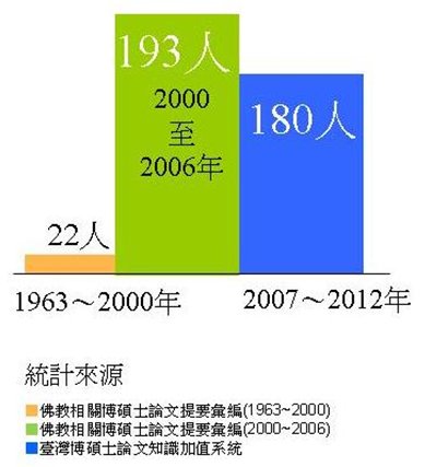 附表1:1953年至2012年臺灣地區出家眾受戒人數統計表 ![]() 【附錄二】臺灣地區正式教育體制內之宗教系所與佛教學院(依成立時間先後排序)