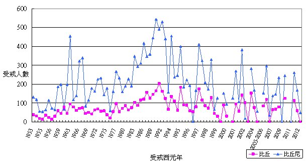 貳、比丘尼的產生與發展 一、比丘尼產生的歷史淵源 (一)佛陀時代:「比丘尼」的由來 佛世時,剛開始女眾是不能出家,佛陀的姨母(即佛陀之母往生之後,由姨母照顧長大)摩訶婆闍波提希望可以跟隨佛陀出家,多次請求佛陀讓她出家,都被佛陀拒絕,後來經阿難三次的請求,佛陀才答應。第一次佛陀的姨母帶了500位剃了頭的宮女,哭啼求佛陀讓她們出家,阿難看見了向佛陀說:「養您長大的姨母為求受出家,哭得很傷心。」佛陀拒絕她們出家,理由是因為女眾業障重,出家會讓佛教正法少了五百年。第二次阿難用親情向佛陀說:「大愛道自幼扶養您長大,對您有養育之恩,今她想出家,您都不能成全她出家。」佛陀說:「不,今可以讓姨母學佛的恩情,比撫養我長大的恩情更大。」佛陀不為所動,仍拒絕姨母的出家。第三次阿難則問佛陀說:「女性是否可以和男眾一樣成佛、證果。」佛陀說:「可以。」於是佛陀答應了阿難的請求,而讓姨母出家了,但必須要遵守八敬法。(註5)從此以後,女眾才可以出家修行,成為僧團的一分子。 (二)中國比丘尼的開始 漢傳佛教的第一位比丘尼,是西晉末年的淨檢比丘尼(291-360),本姓仲,名令儀,自幼好學有才華,奉父母之命結婚,後來遇到戰亂,父親與先生為國犧牲,仲令儀在生命痛苦時,認識了從西域來的智山法師、法始法師、佛圖澄尊者。佛圖澄法師為他講經說法並教她打坐,於是開始向道修行,感受修行的利益,使她生起羨慕想專心出家修行,於是向法始法師請求出家,她說:「讀經典知道佛陀弟子有比丘及比丘尼」,因此女性是可以出家,但法始法師說印度比丘尼要到比丘處做二部僧眾授戒才能圓滿受戒,中國制度不全,故請問智山和尚;後來智山和尚說令儀已皈依三寶,對佛法信心堅定,又讀很多經典,因此同意仲令儀受沙彌尼戒,於是淨檢於東晉(西元357年)24歲時出家受沙彌尼戒,成為「沙彌尼」。 中國佛教的比丘尼戒是直到淨檢67歲時,由比丘曇摩羯多於洛陽,依照《僧祇尼羯磨》為其授戒。當時淨檢在沒有比丘尼的情況下依比丘僧出家、受戒,而引起爭議。另外,有《比丘尼傳》、《大宋僧史略》記載,南朝宋元嘉十一年(434),僧伽跋摩於建康的南林寺設戒壇,有獅子國(斯里蘭卡)的鐵薩羅比丘尼等11位比丘尼來到中國,為景福寺尼眾慧果、淨音等於二部眾中授比丘尼戒,成立了中國第一批二部僧中受具足戒的比丘尼,計三百多人。(註6) 由以上的介紹,我們得知中國比丘尼戒的淵源歷史,淨檢開創了中國比丘尼的先鋒,使得中國比丘尼可以代代相傳。 (三)臺灣比丘尼的出現 臺灣地區何時開始有比丘尼出現?釋慧嚴指出:「根據大正8年(1919年)的《開元寺同戒錄》,可以發現當年赴開元寺受比丘尼具足戒者有79位」,又從1919年至1940年的同戒錄(詳見表一)(註7)得知當時受戒的比丘有232人,比丘尼有352人,出家眾共584人,比丘尼約占60%、比丘約占40%,因此還是以比丘尼占多數;不過1919年時則是以比丘人數為多,有84人,但後來逐年遞減,反倒是比丘尼人數逐年增加,這些現象背後的原因,值得再探究。另外,1949年以前臺灣地區佛學院極少(註8),受教育的管道大多來自三壇大戒,依戒場的戒師學習佛陀教法、威儀與僧格。 表一:1919年至1940年比丘、比丘尼受戒人數